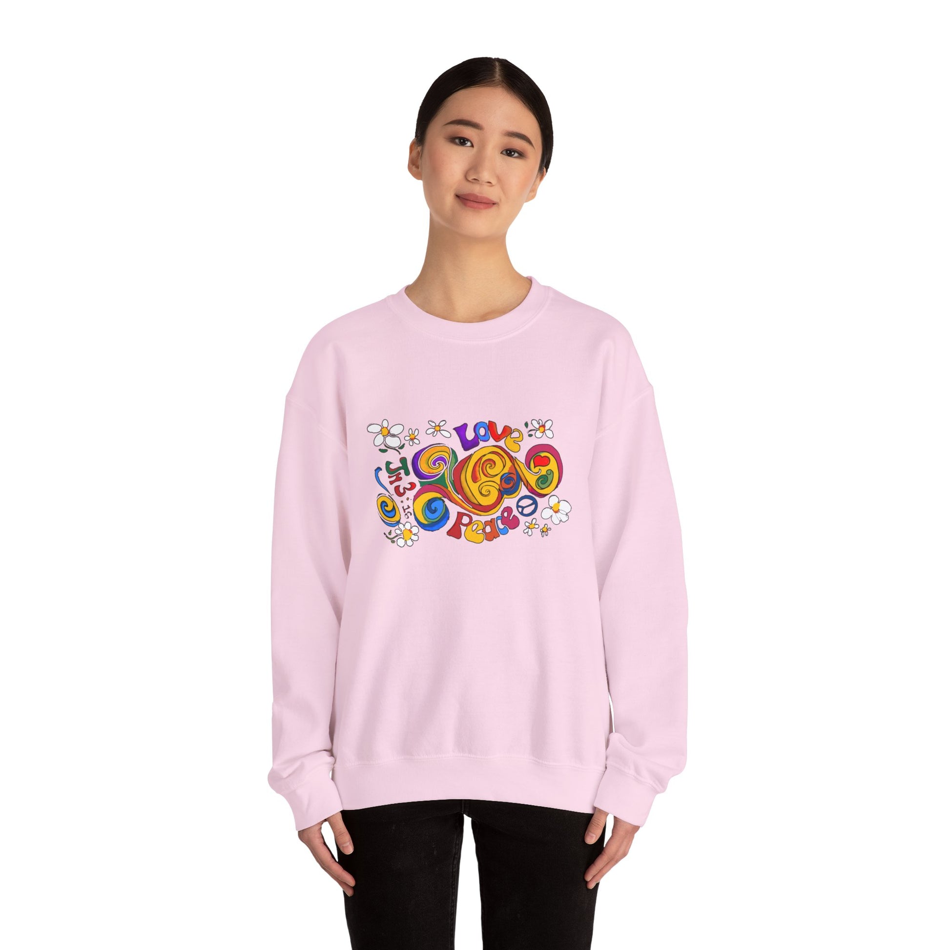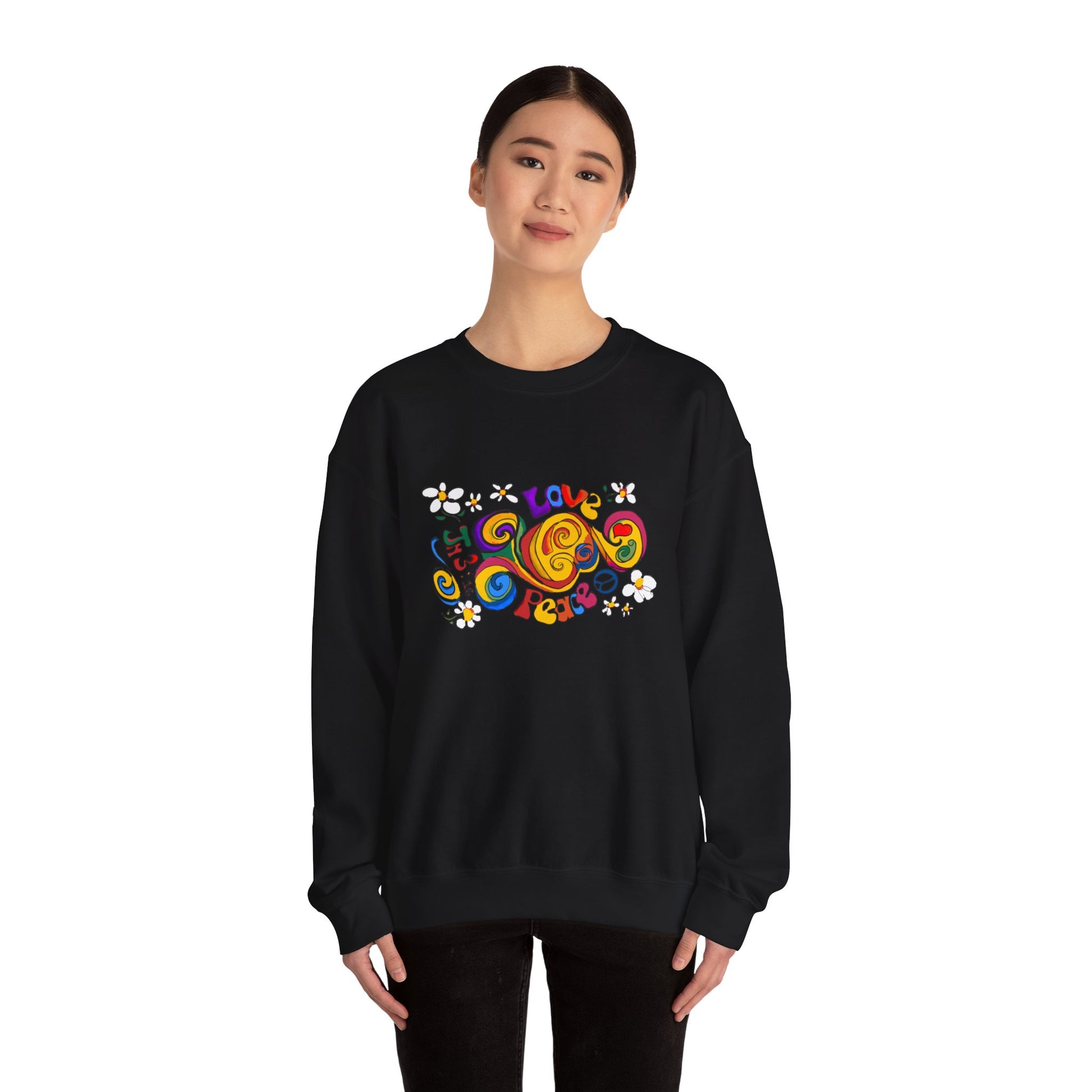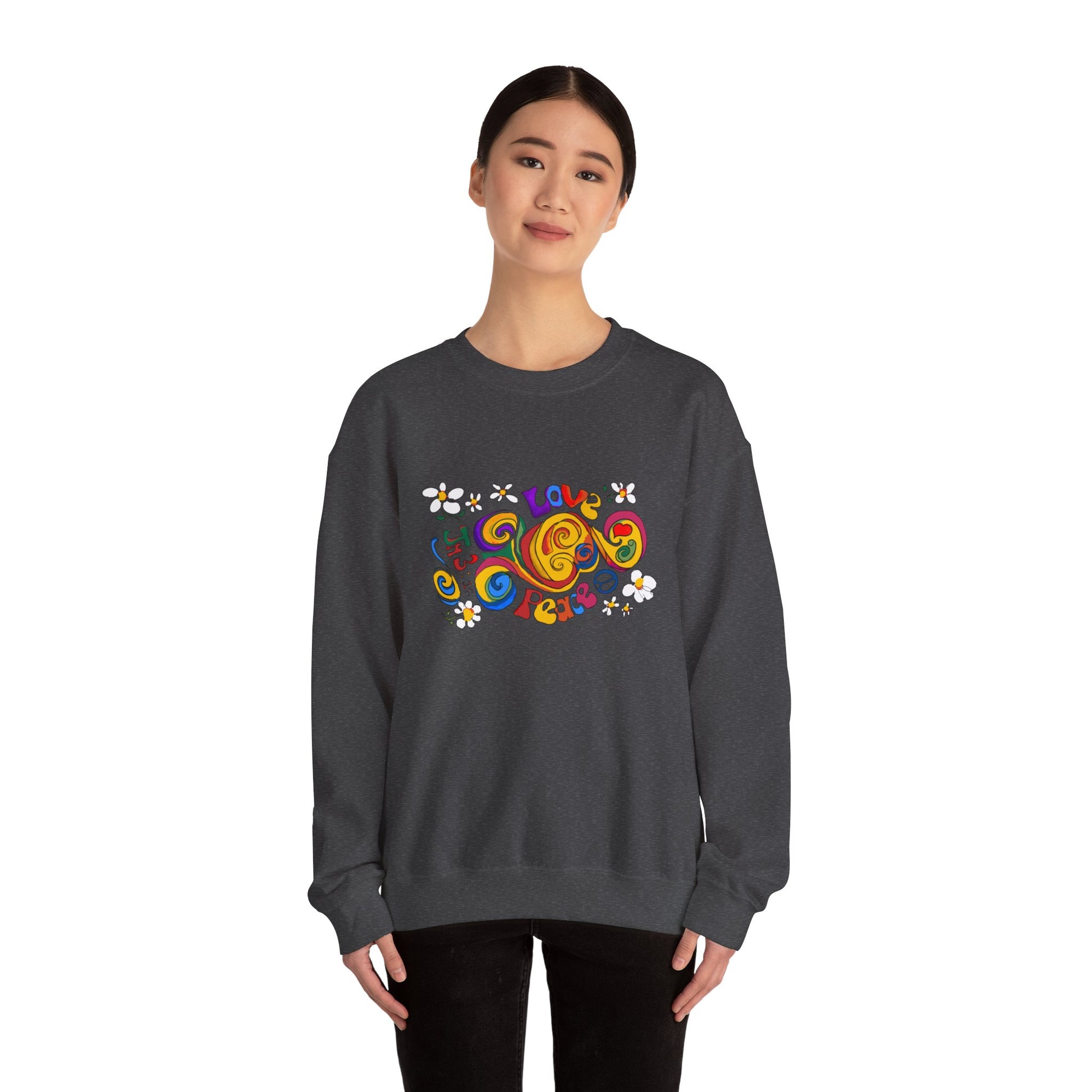 Stay cozy and stylish with this unisex heavy blend crewneck sweatshirt, designed for those who appreciate comfort and creativity. The vibrant, playful artwork featuring messages of love and peace brings a cheerful vibe to your wardrobe, making it perfect for casual outings, gatherings with friends, or even cozy nights in. Ideal for anyone who loves unique fashion with a message, this sweatshirt is a great gift for birthdays, holidays, or just because! Celebrate occasions like Valentine's Day, Earth Day, or any day that calls for expressing positivity and joy. Embrace a warm, welcoming atmosphere in this essential piece!